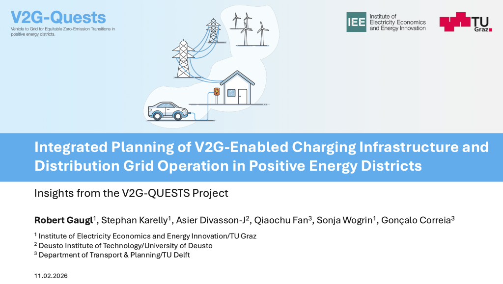 The V2G-QUESTS project aims to provide comprehensive guidelines for the adoption of Vehicle-to-Grid (V2G) technology within urban Positive Energy Districts (PEDs), ensuring equitable access to clean energy transitions. It examines the potential of electric vehicles (EVs) as dynamic energy storage solutions that can balance the grid and support the integration of renewable energy sources.